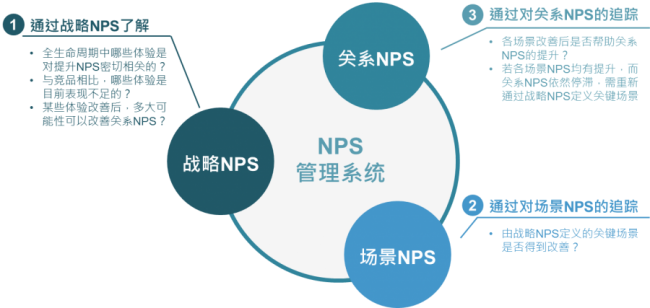 针对业者的课题,我们提出NPS方法论,一套自规画到执行落地的体验管理体系,进行体验现况的诊断。NPS(净推荐值)是一种客户忠诚度衡量指标,问题是「0-10分,你有多愿意推荐本公司给你的亲朋好友?0分是绝对不推荐,10分是绝对推荐」,其中分数落在0-6分的客户被归类为企业的批评者,7-8分为中立者,9-10分则是推荐者,也就是企业的忠诚客群。比起客户满意度,NPS问题更能够真实反映客户的心理与行为,调查结果被证实与企业的商业表现,如财务指标有高关联度,因此近年领先市场越来越多企业逐渐采用此指标取代客户满意度作为客户反馈机制。