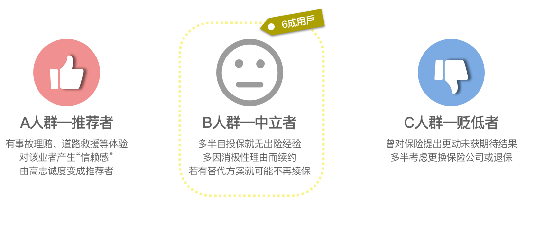 第一件我们要做的事是重新检视用户的关键体验旅程,针对C人群贬低者经历过的负面体验进行优化,减少贬低者的产生。 但对于该业者来说,更重要的是这群占了6成的中立者,我们需要将这群人转为推荐者。 在NPS研究时,发现推荐者都反复提到“信赖感“这个词,进一步询问后,发现信赖感来自于该业者对于理赔流程的处理,如简化的申请程序、快速的资金到帐,让申请理赔的客户有被照顾的感觉,而产生信赖。 但这些中立者并没有理赔或任何道路救援的经验,很难彰显该业者的长处。